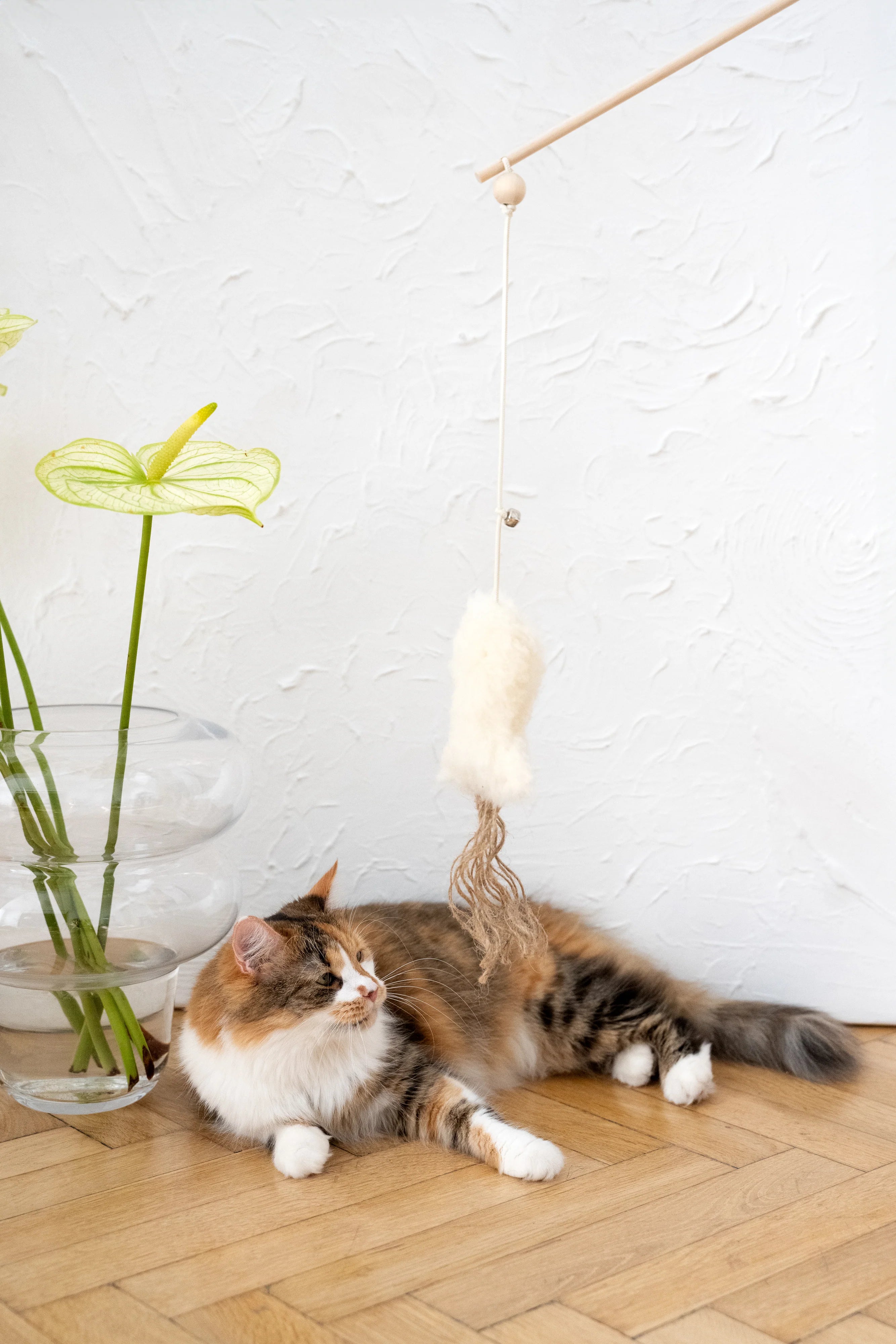 Floaty. Furry. Fierce. This natural sheepskin fish is designed to mimic real prey, complete with a jute string, soft bell, and your choice of a feather or jute tail. Pure feline enrichment with zero plastic and maximum thrill. It’s the sustainable toy your cat actually wants to hunt.