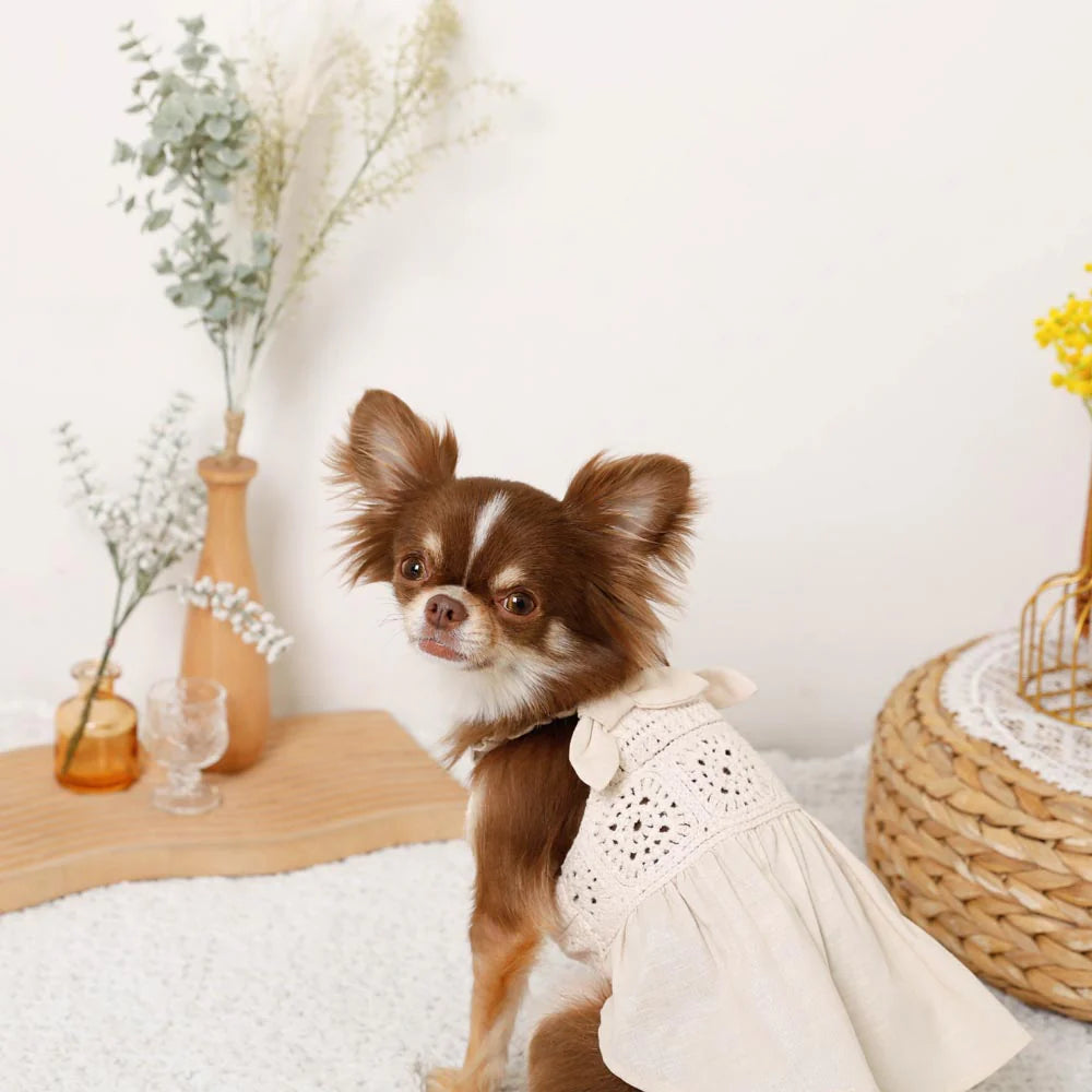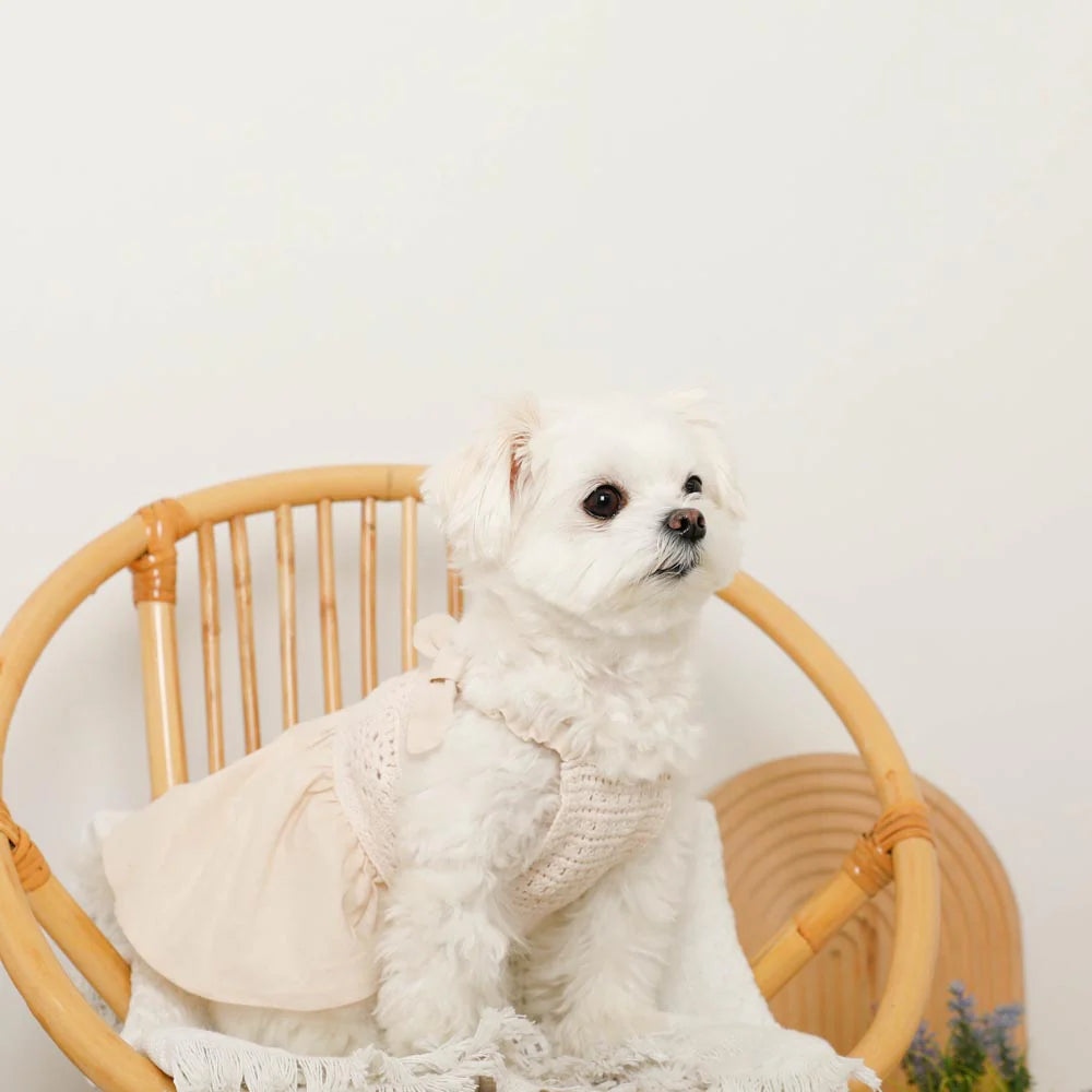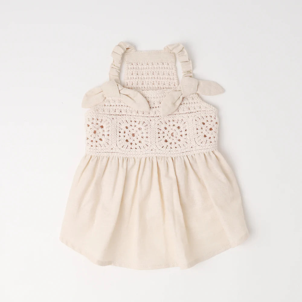 A lightweight summer dress crafted from a soft cotton-linen blend with charming knit texture and fixed shoulder bows. Treated with a cool-touch finish for added comfort in warmer weather.