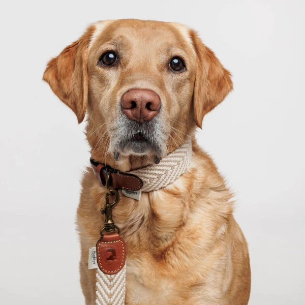 The Portixol Sand Collar's soft colours remind us of warm summer days, and its summery look is completed with cognac-coloured leather details. It is a very lightweight and wide collar designed to give your dog comfort, both during the day and when you’re out and about.