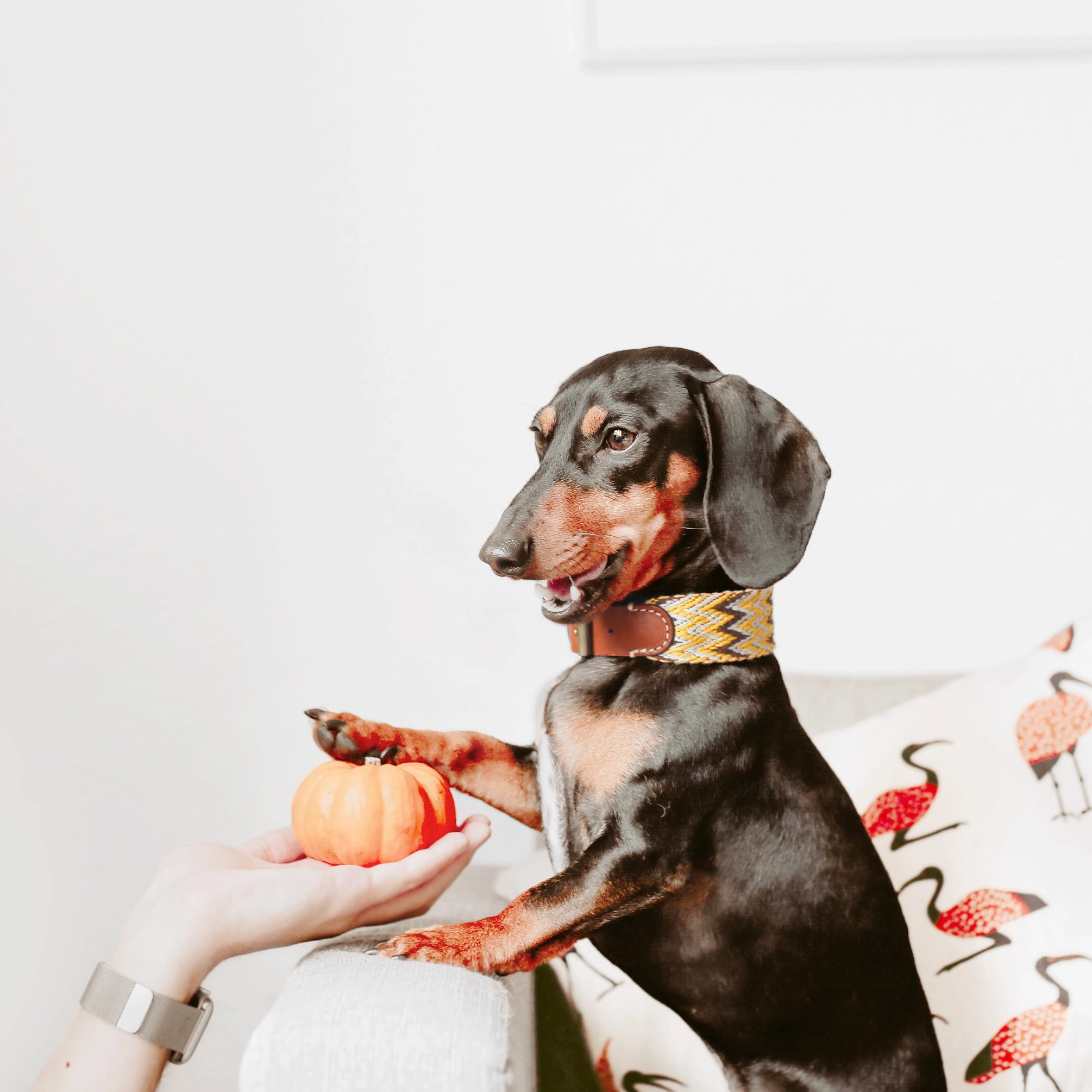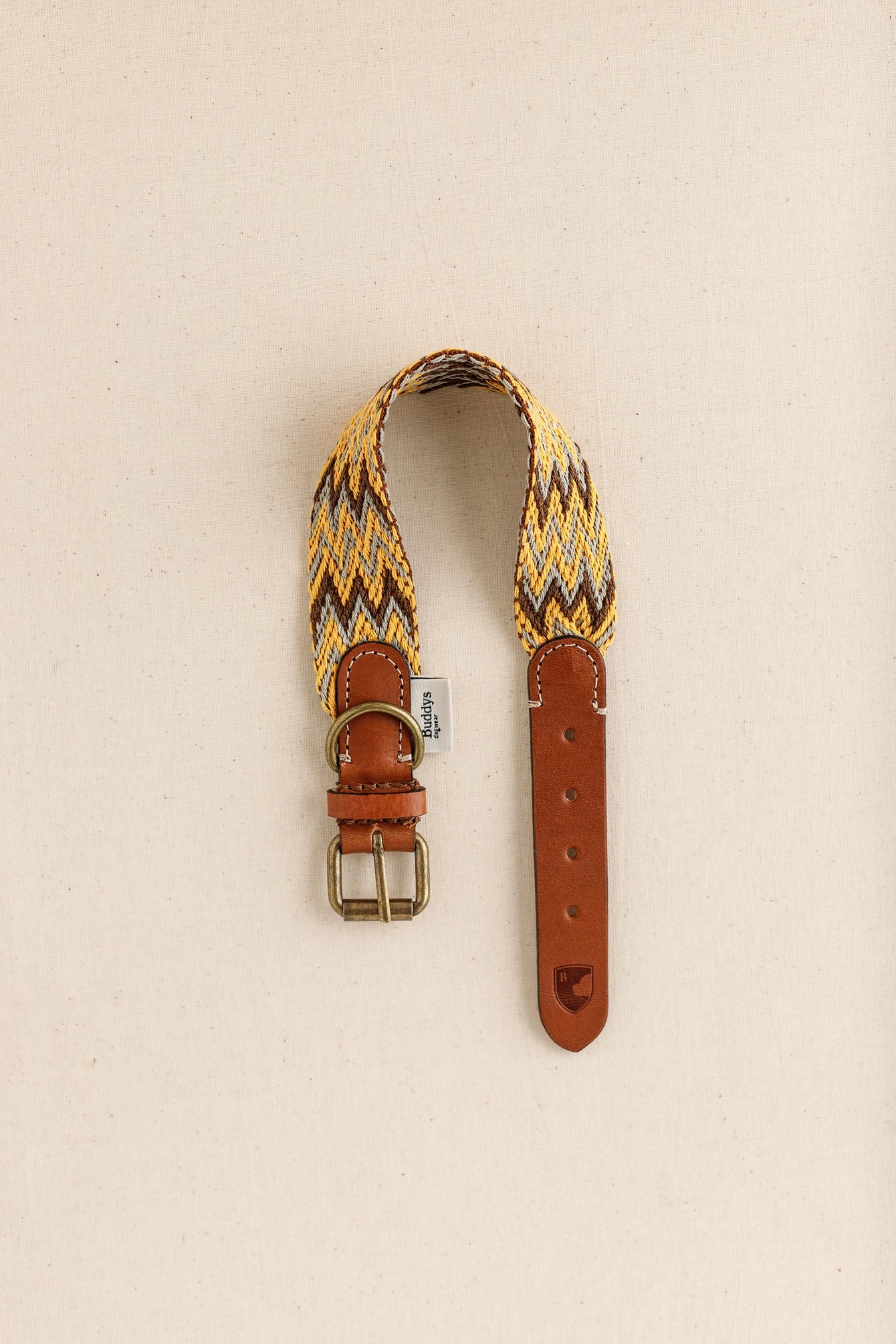 Add timeless style to your dog’s walks with this woven dog collar featuring warm yellow, brown, and cream tones. Finished with genuine leather ends and sturdy brass hardware, it’s designed for comfort, durability, and everyday wear. A perfect blend of craftsmanship and classic style for dogs who deserve the best.