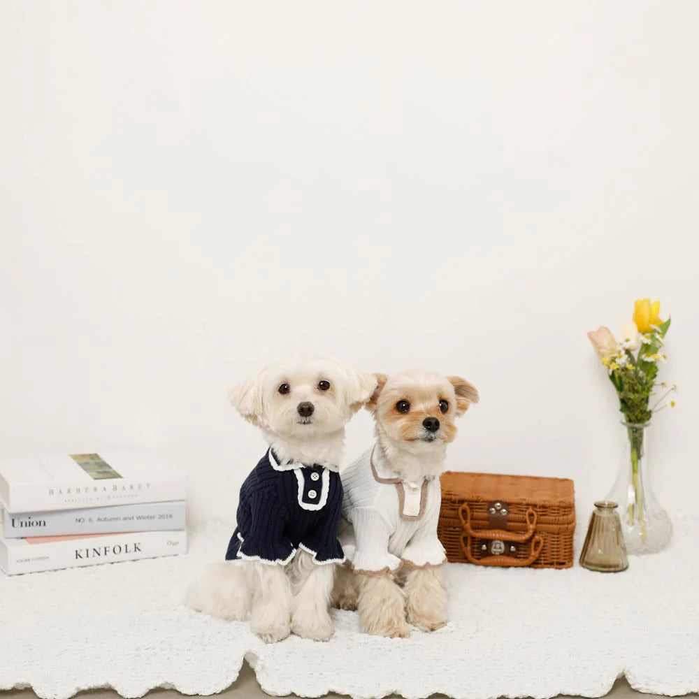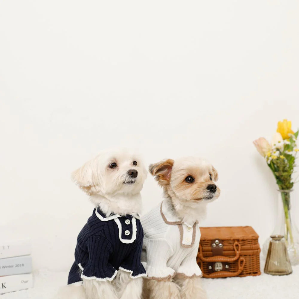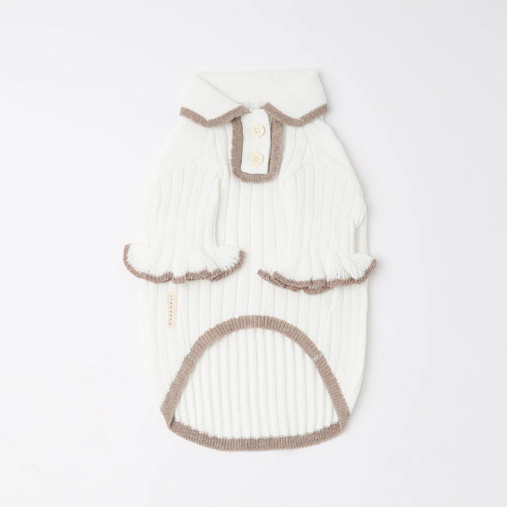 A sweet knit with delicate frill detailing at the collar and sleeves. Soft, stretchy, and easy to slip on.