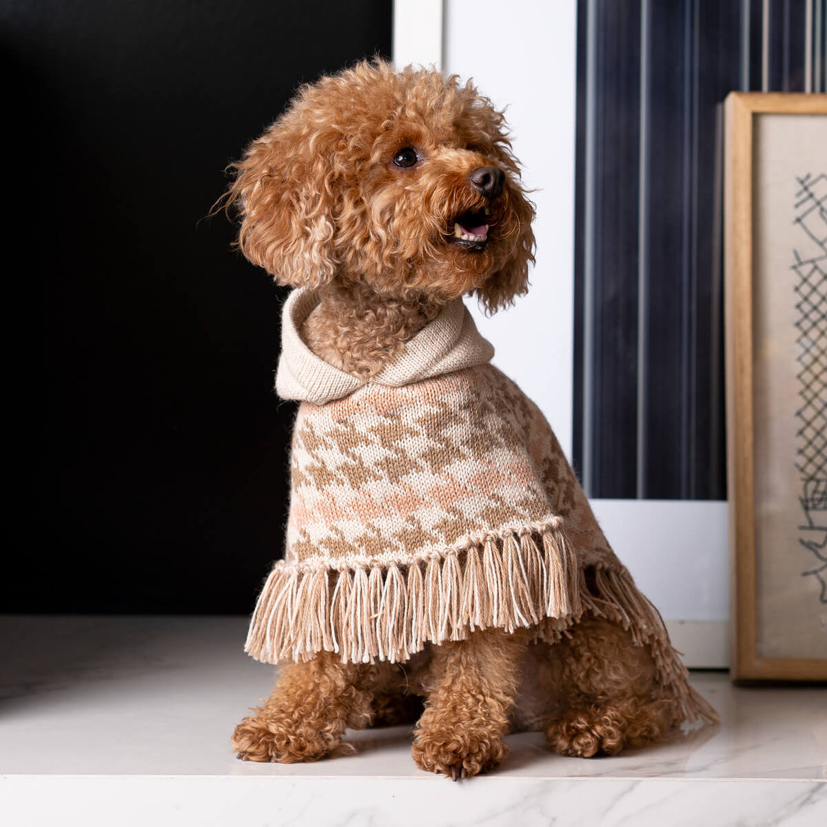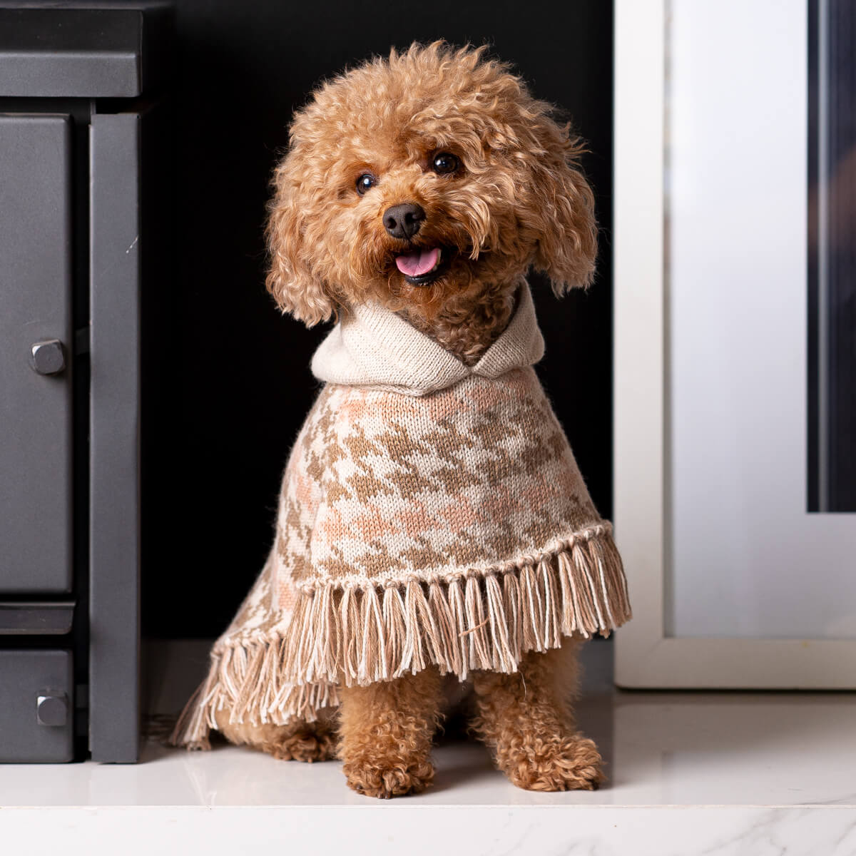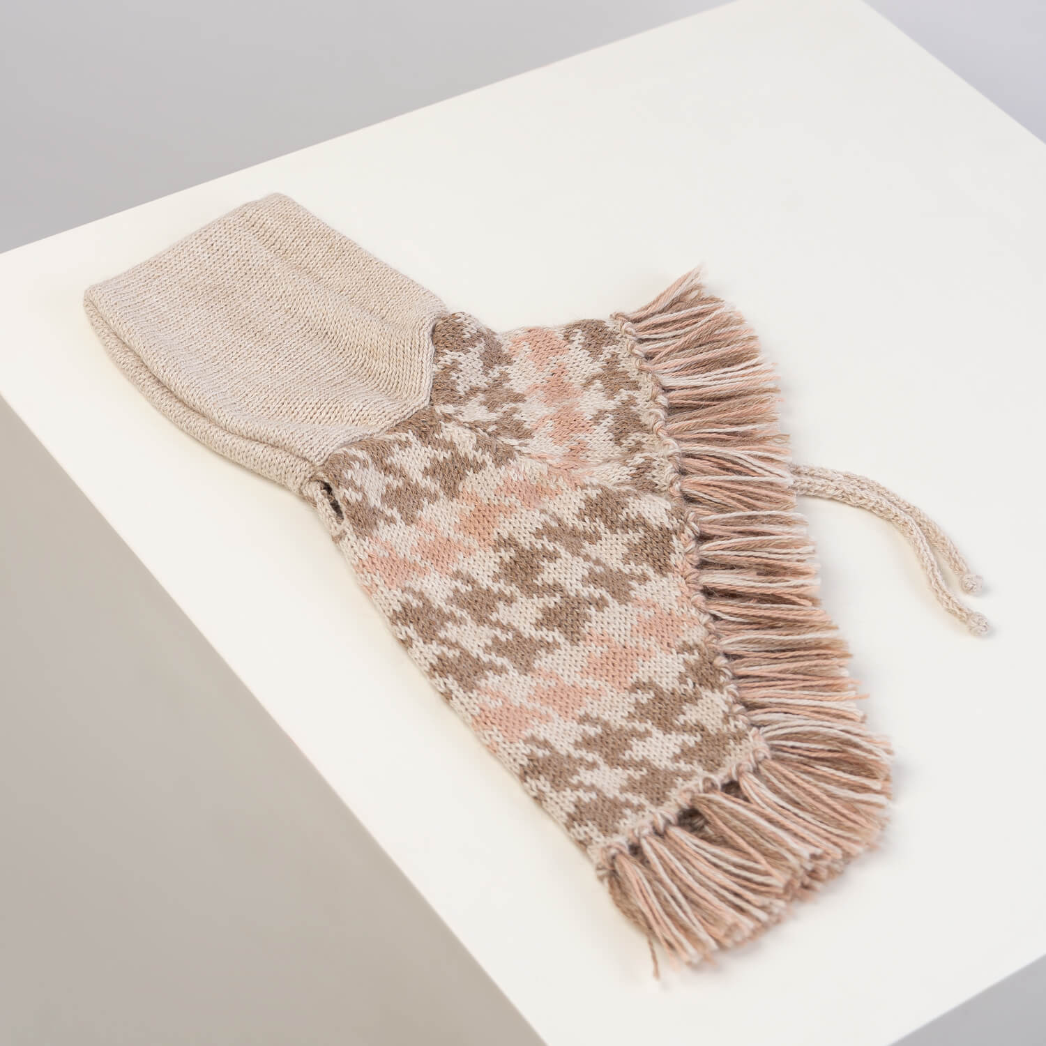 The soft alpaca houndstooth poncho is a graceful nod to tradition, reimagined in cosy, gentle tones and finished with an adorable hood designed for sweet walks and even sweeter moments.